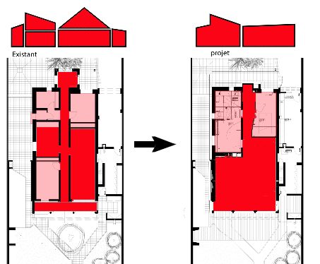 Conception globale d’un pavillon. Optimisation des volumes, par la démolition de volumes et ouvertures d’espaces.